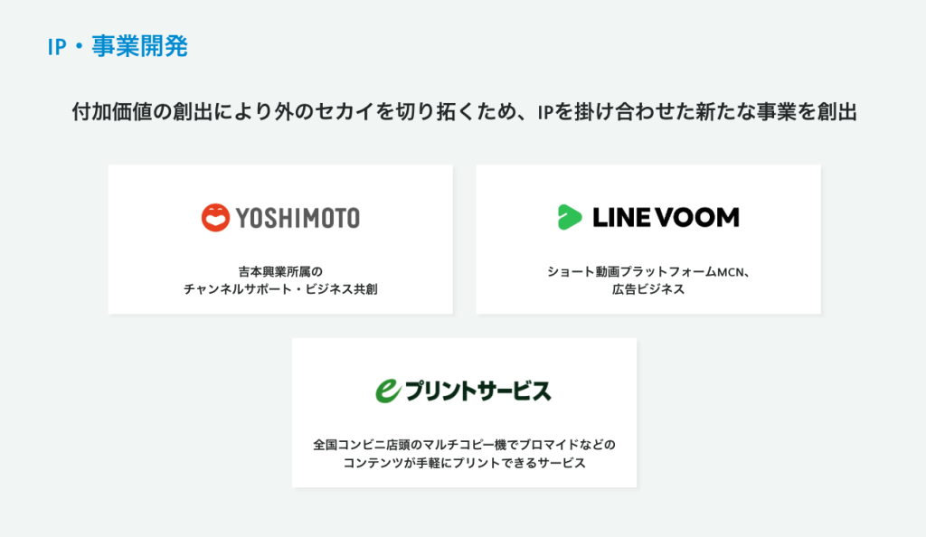 クリエイターのIP(知的財産)に新たな価値を付加し、既存の枠を超えた事業を創出。本来のIPの価値をクライアントや他のIPとの共創を通じてさらに最大化していきます。まだ誰も見たことのない新しい世界を切り拓き、人々に驚きと感動を届けていきます。