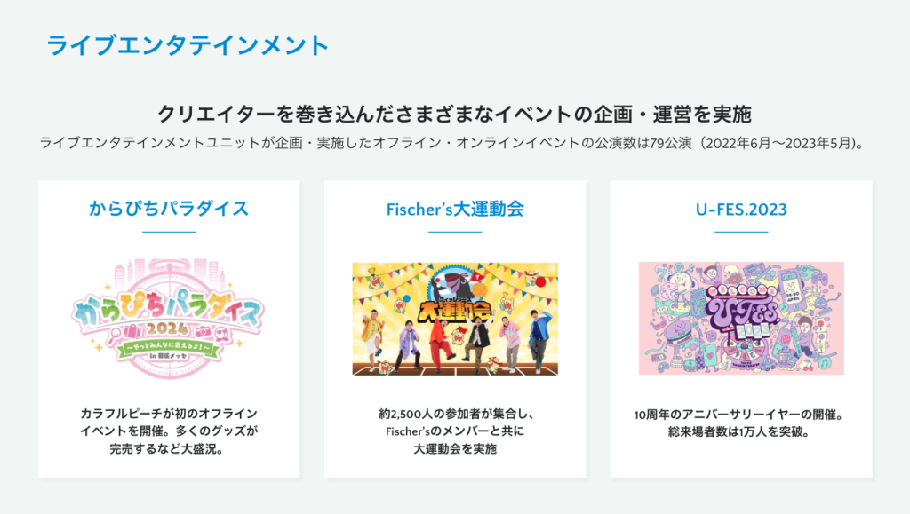 クリエイターを巻き込み、オンラインからリアルまで、多彩なイベントを企画・運営。それは、画面の中の才能を現実世界へ解き放ち、ファンとクリエイターが一体となる空間を生み出します。クリエイターの情熱を形に変え、ファンの心に深く刻まれる記憶を創造していきます。